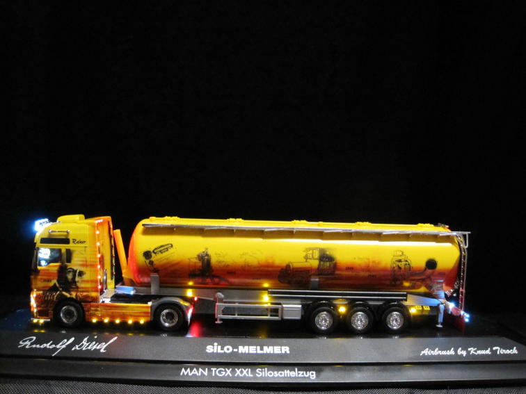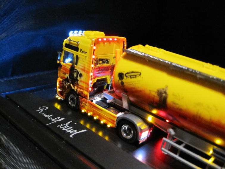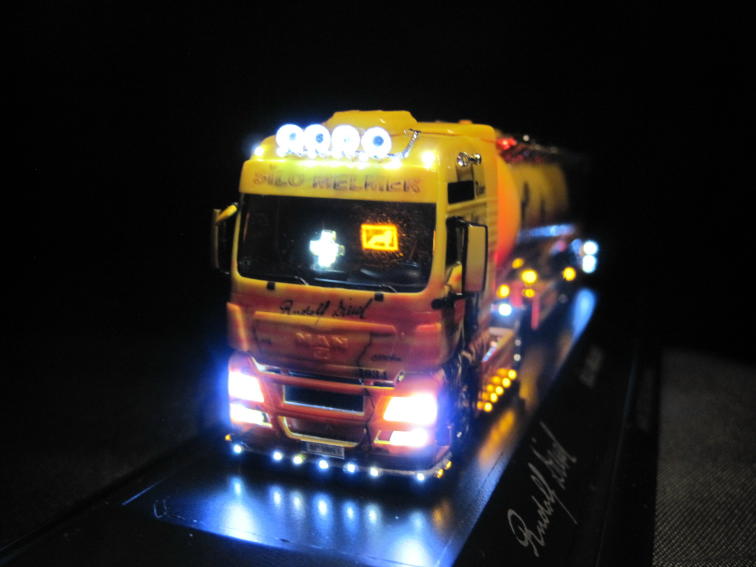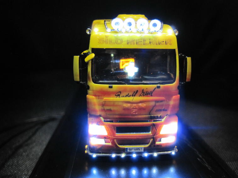 hinterleuchtetes MAN-Schild an der Rückseite der Fahrerkabine (12 LED), beleuchtetes Kreuz an der Frontscheibe (4 LED). |