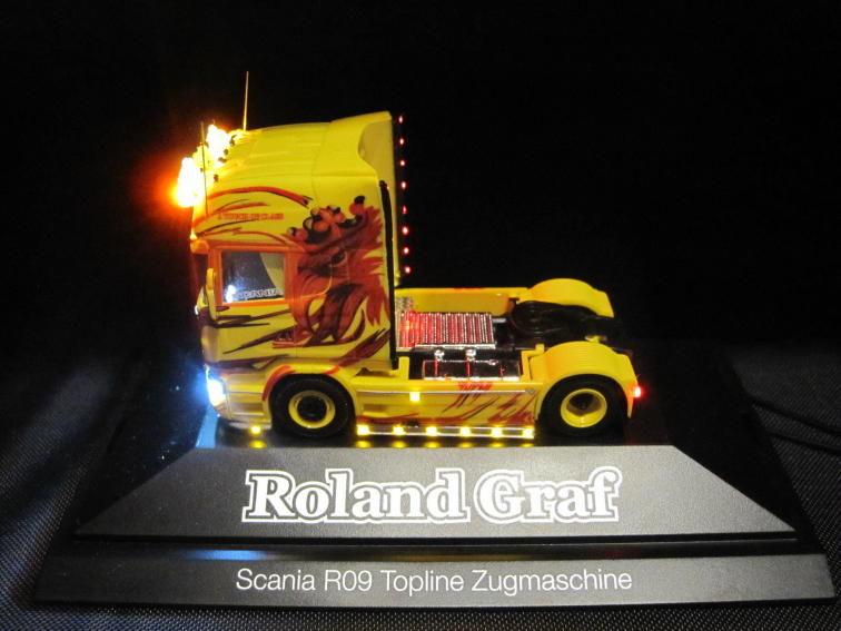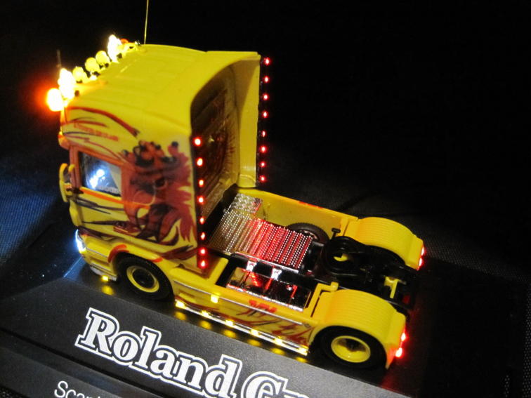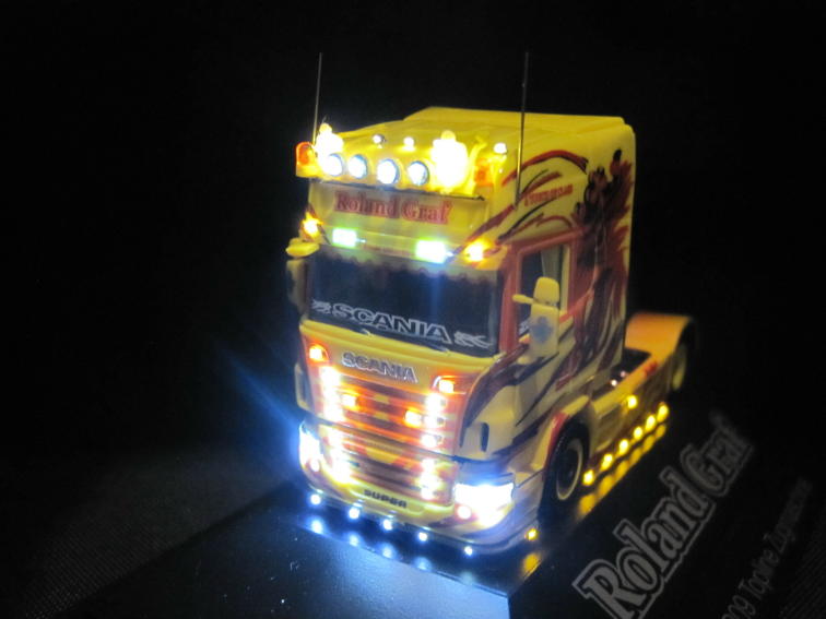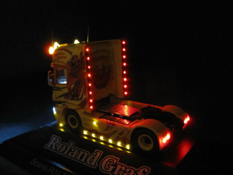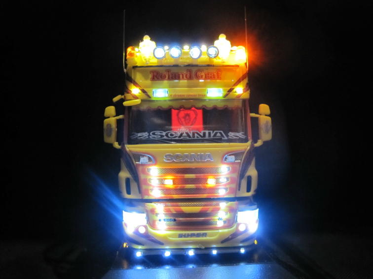 hinterleuchtetes Scania-Logo an der Rückseite der Fahrerkabine (16 LED). |