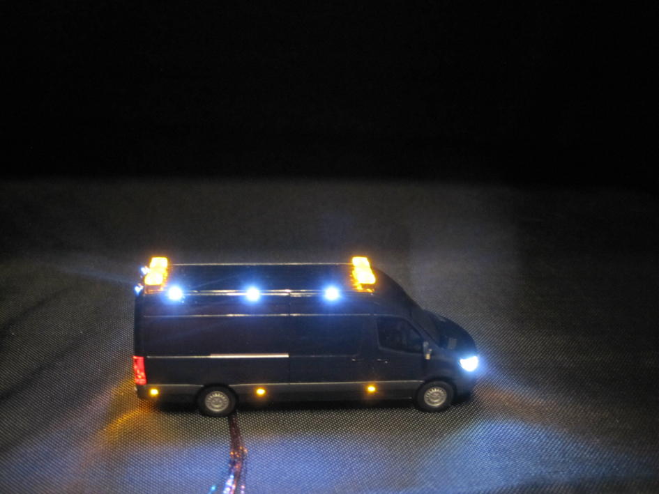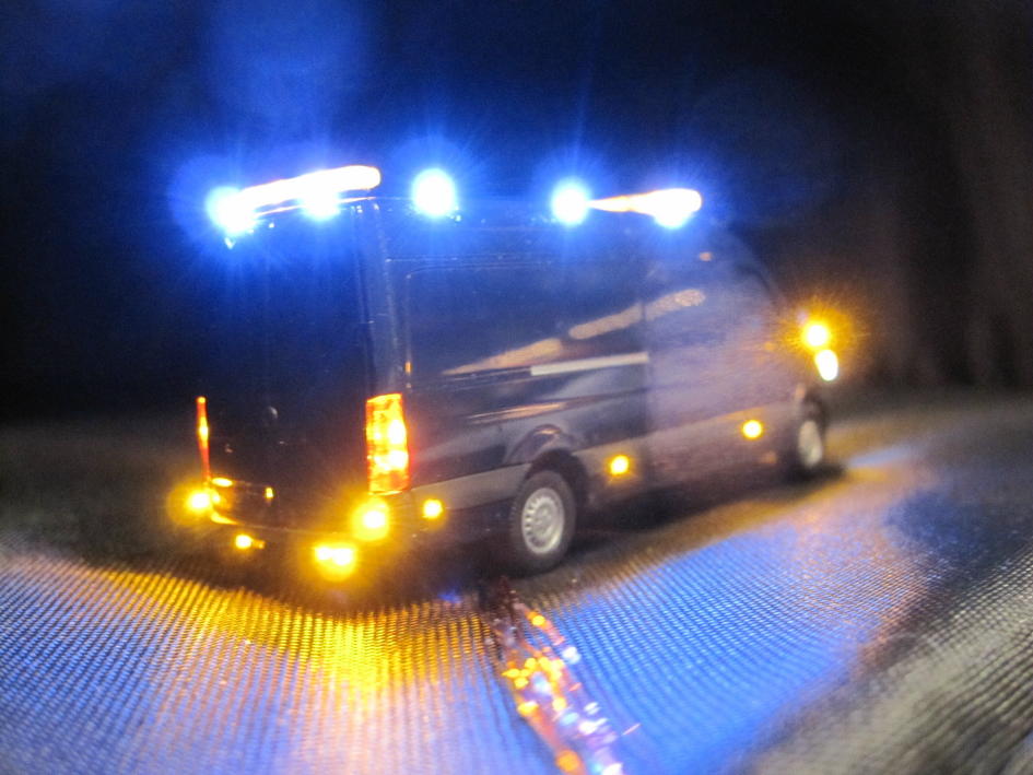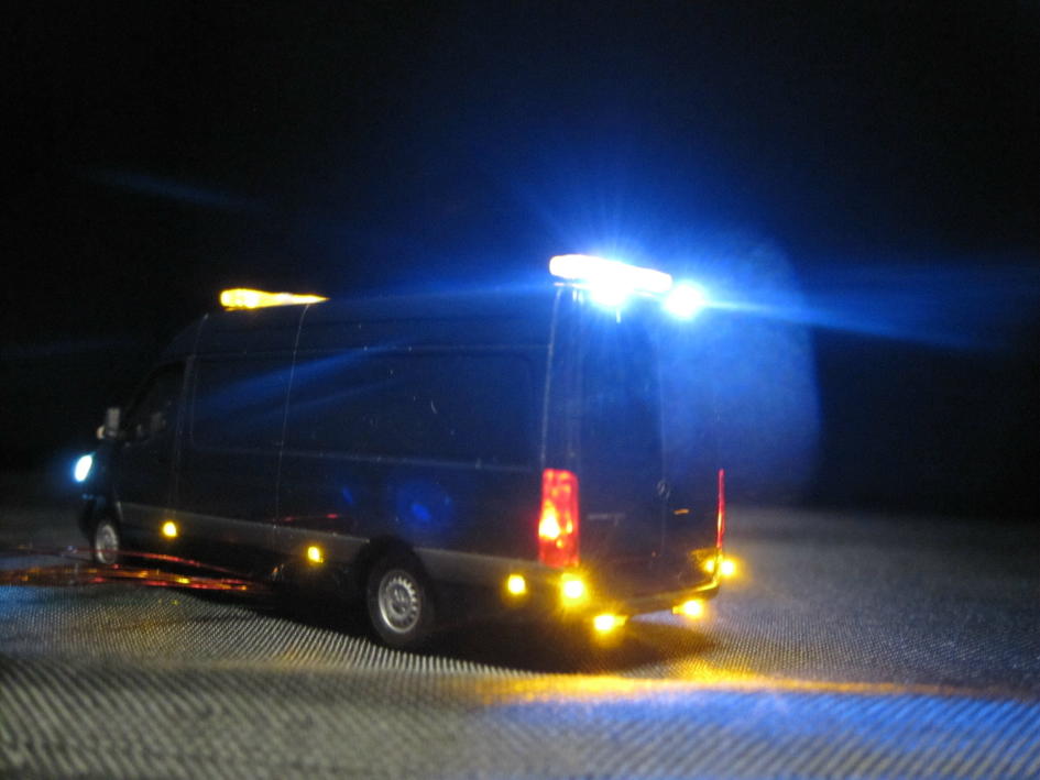Frontblitzer im Kühlergrill (6 LED), Dachwarnleuchten vorn (12 LED), Dachwarnleuchten hinten (12 LED), Heckwarnleuchten (6 LED), Warnblinklicht (6 LED). |