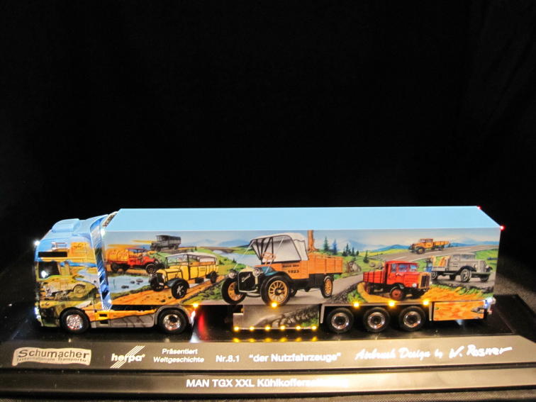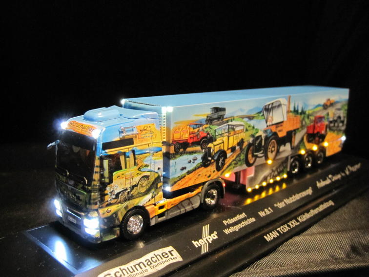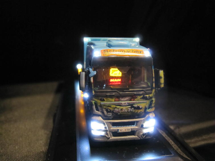 Armaturenbeleuchtung (2 LED), hinterleuchtetes MAN-Schild an der Rückseite der Fahrerkabine (3 LED), hinterleuchtetes MAN-Logo an der Rückseite der Fahrerkabine (10 LED). |